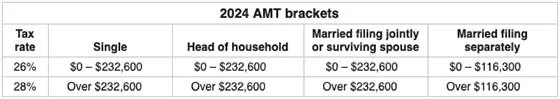 Like the regular tax brackets, the AMT brackets are annually indexed for inflation. In 2024, the threshold for the 28% bracket will increase by $11,900 for all filing statuses except married filing separately, which will increase by half that amount.